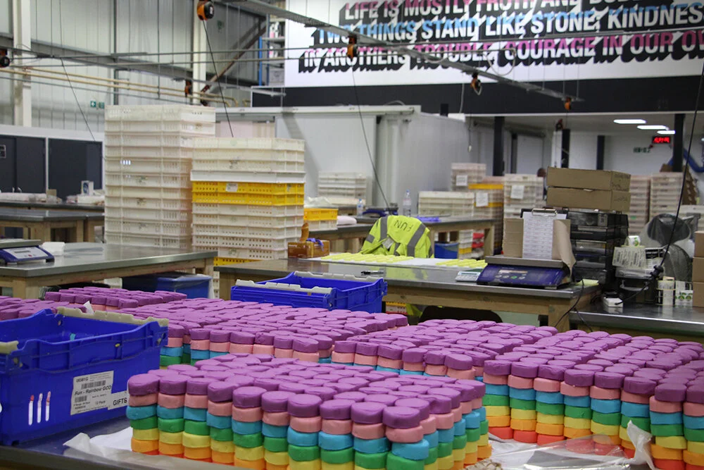 The factories, of which there are many including Ballistics (bath bombs), Massage (anything moisturising), Soaps (allllll the soaps), Gifts (Christmas!) and Fresh (face masks, scrubs and cleansers) , are filled with people working with their hands. In fact, Lush is a huge local employer, with well over 1000 in & around Poole, and pays a living wage to everyone that works for them as well as implementing loads of wellbeing initiatives to protect the health of manual labourers. Over 150,000 products a week are sent out from just one of the factories in busy periods, each one made fresh one day, in the store the next day.