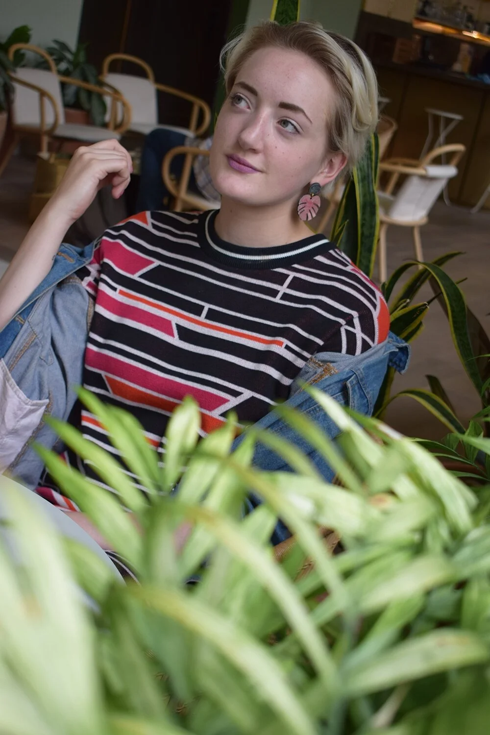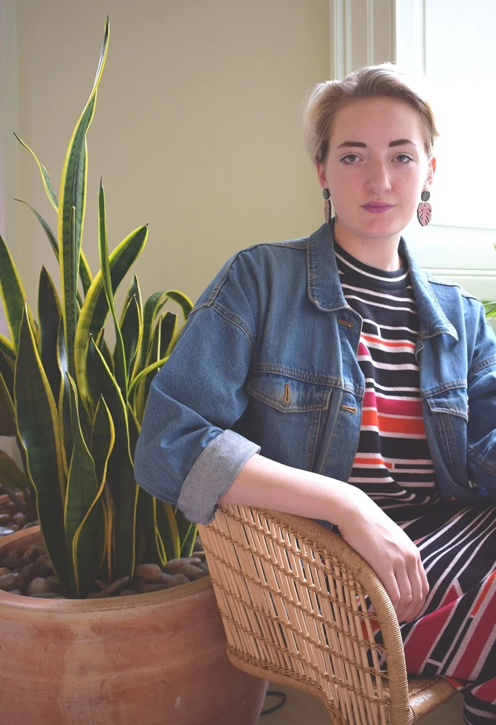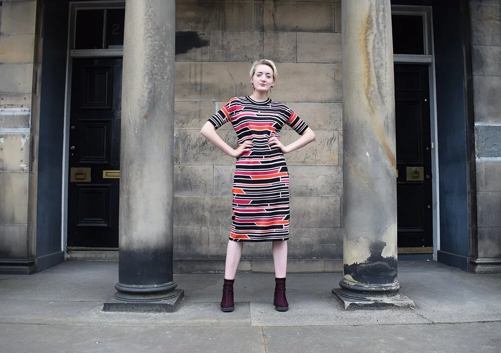 I decided to pair this maximalist midi dress with equally bold palm leaf dangly earrings by print design queen Mica Peet, along with some chunky boots and my old oversized denim jacket. Finally, the look was finished off with an accessory from another fabulous ethical fashion brand, Wyatt & Jack, who make upcycled bright and bold bags from old deck chairs and bouncy castles.