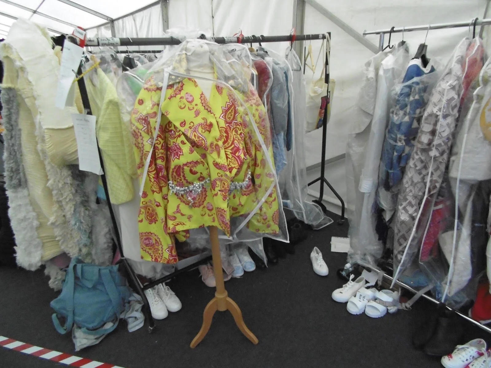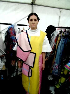 Here are just some (out of hundreds of designs!) of the fabulous outfits we got to dress up in, and sometimes have to be pinned and stitched into! On the top left is me wearing my absolute favourite concoction by third year Ruth Williams; an innovative harness backpack and crossover wrap skirt with mesh and sheer detailing. This was part of the branding project 'Kino' which the two beautiful models in the next picture wore looks from also. The whole collection was perfectly cohesive yet unique, in colour, silhouette and accessorising.