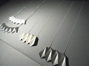 Body sensitive Necklaces in silver and ceramic geometric designs that help monitor light intake, possibly a treatment for S.A.D. Also a matching origami light. Very sci-fi from product design graduate Emily Annand