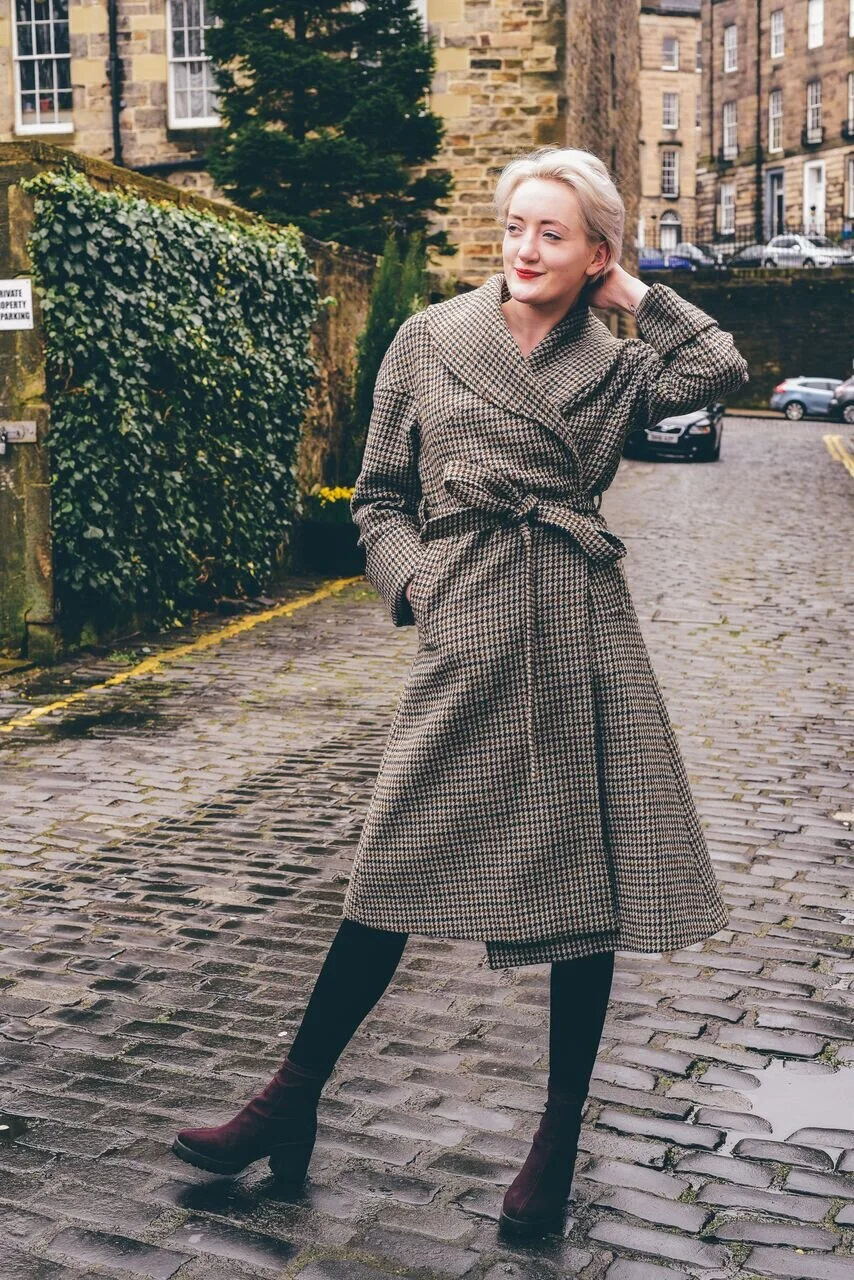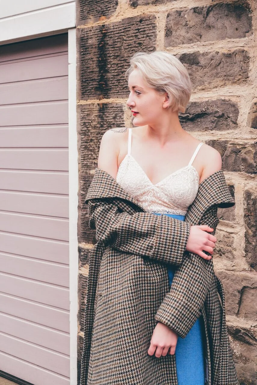 Here, I'm wearing the 'Cora' coat in check (buy here), a versatile a-line wrap coat with a statement shawl collar and roomy pockets, and the 'Edie' dress (buy here), an empire line, body-hugging slip camisole dress with an intricate white lace bodice and retro-style Harris Tweed pencil skirt in powder blue. Both garments are available in various other colourways too!