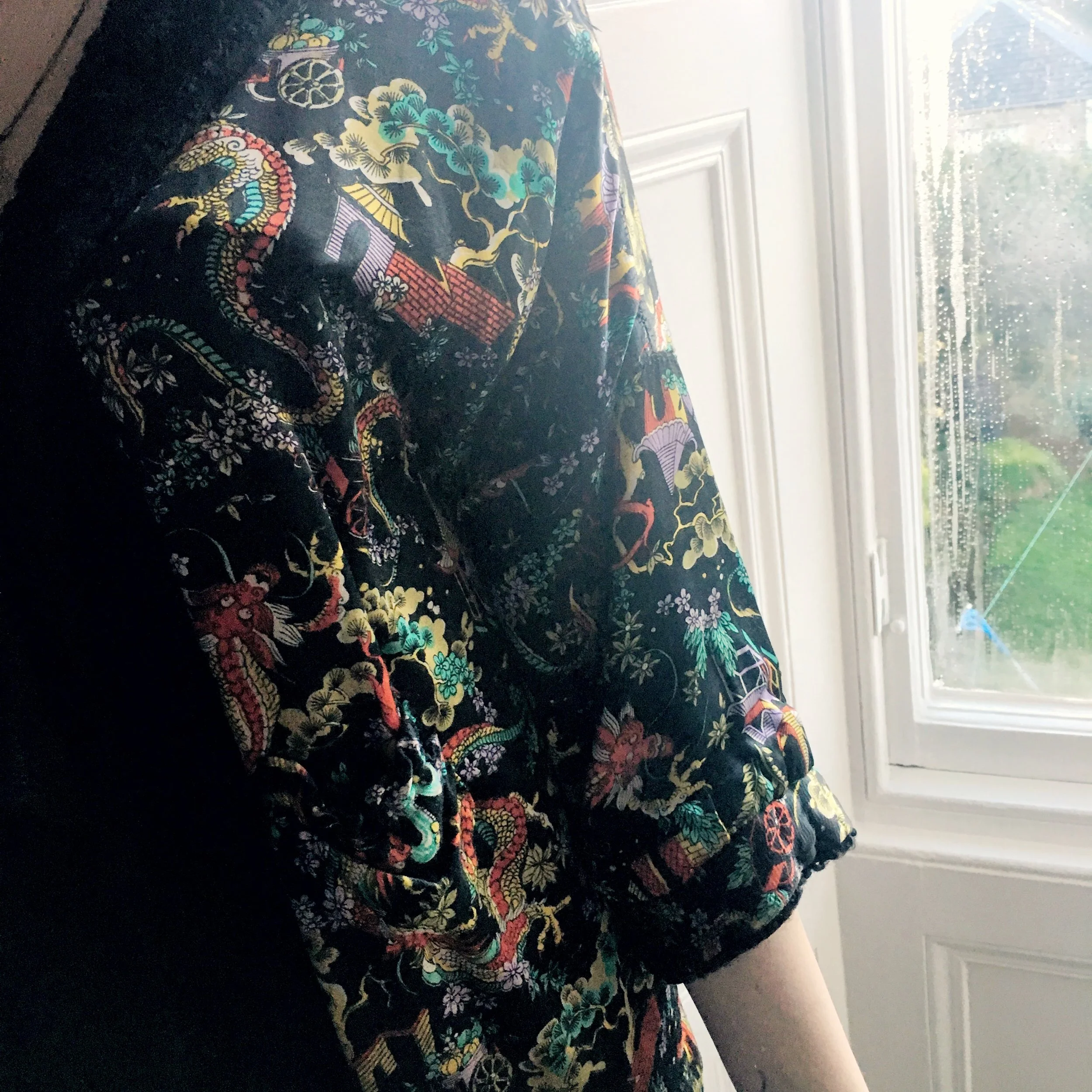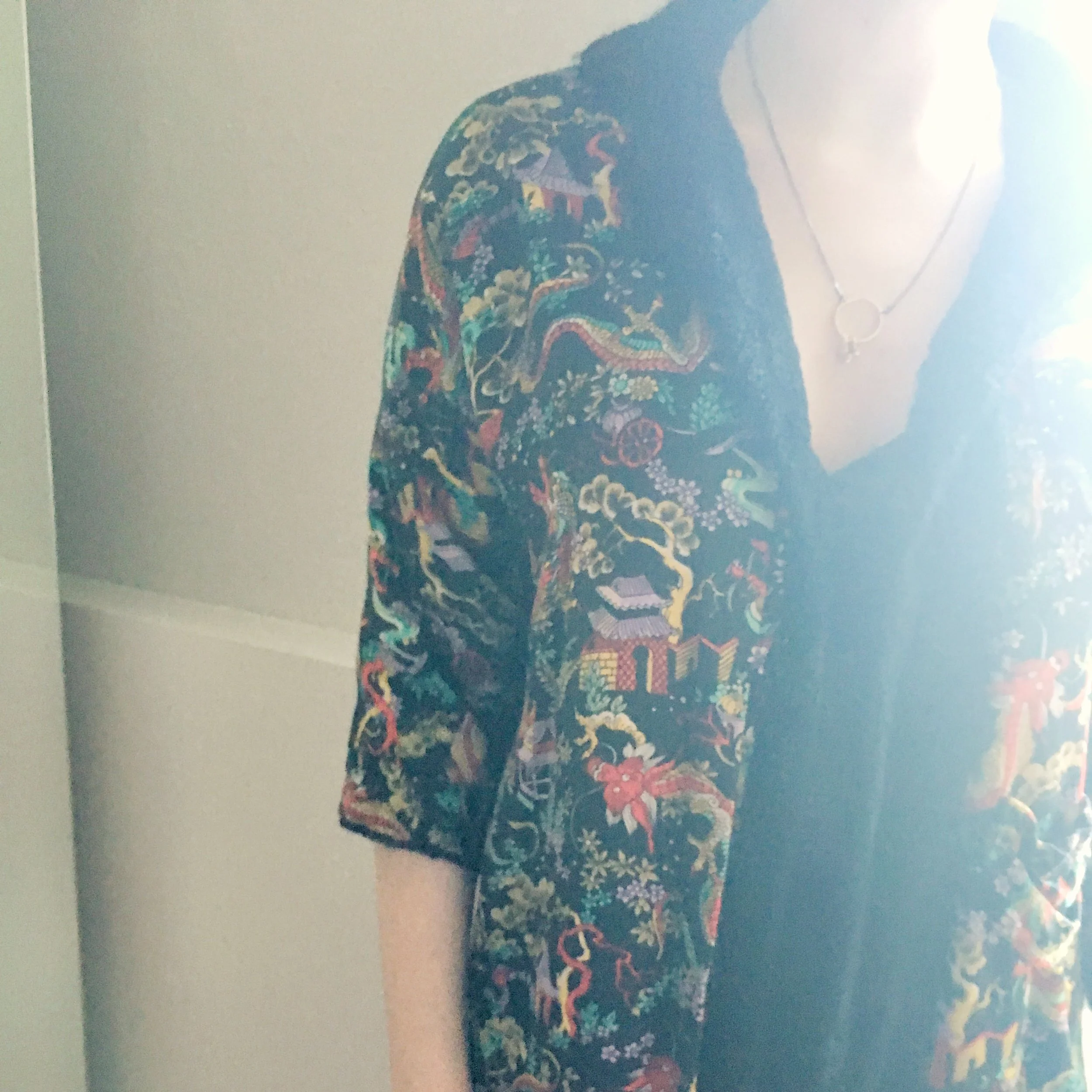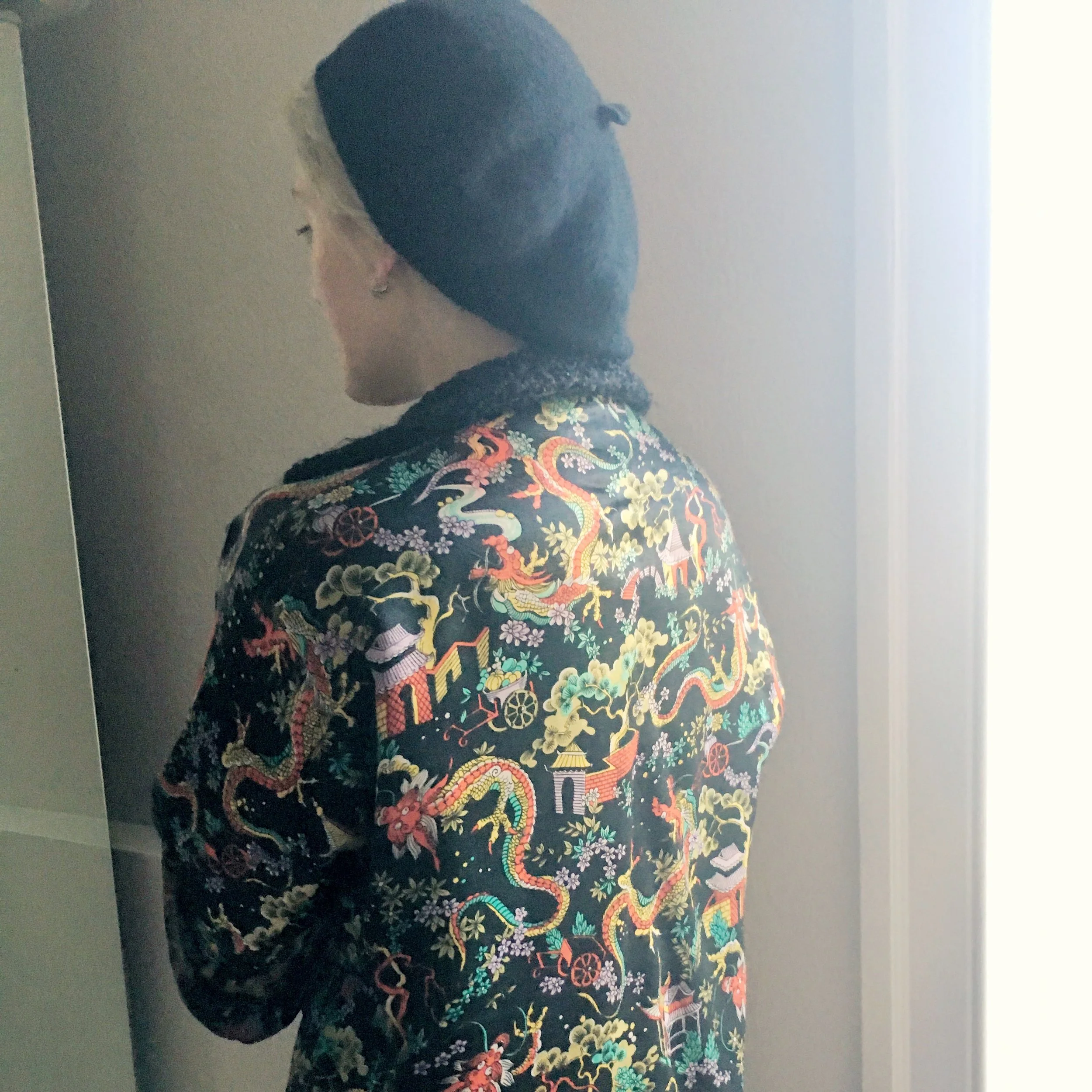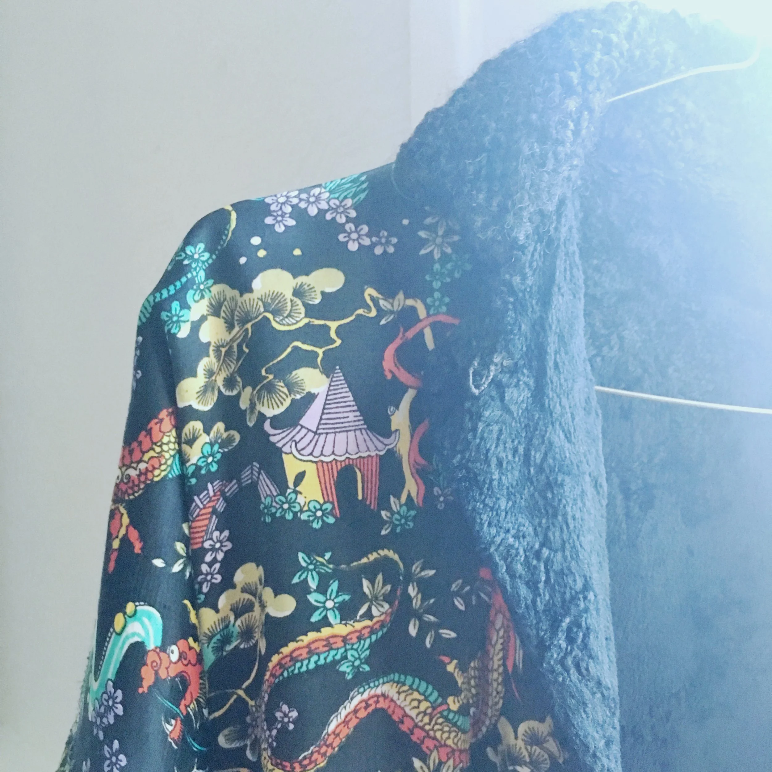 The inner material is faux silk procured on a trip she took to China, and the outer lack fake fur procured in America. The sleeves are 3/4 length as the jacket would always be worn with long kid leather gloves, usually adorned with pearl buttons during the 50s and 60s. What I really love about it though is that it is fully reversible with no visible seams, so it's very versatile and adaptable.