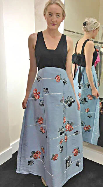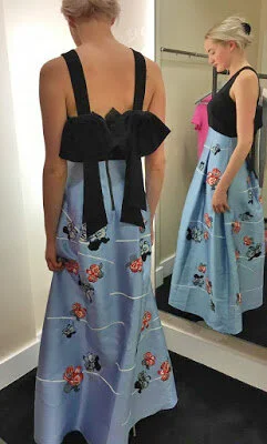 My first outfit was a Sachin & Babi light blue satin gown with embroidered floral design, sequin embellishments, contrast black crepe bodice, and oversized bows at the back. You can buy the dress here.