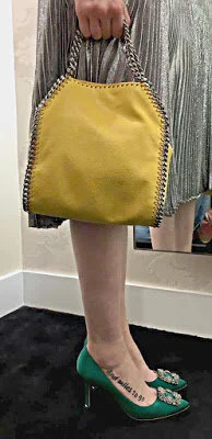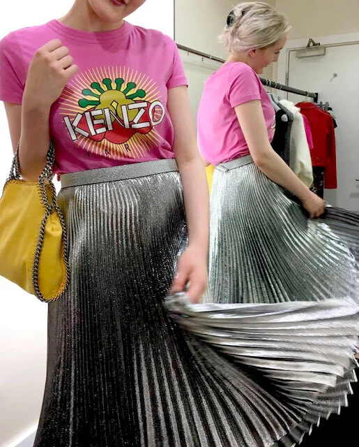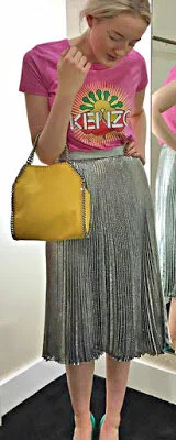 For this one we paired the most beautiful metallic, sparkly pleated midi skirt by Christopher Kane (see that swish!) with a hot pink t-shirt by Kenzo, fabulous wee yellow chain handbag by Stella McCartney and finally, mesmerising emerald Manolo Bhanik stilettos.