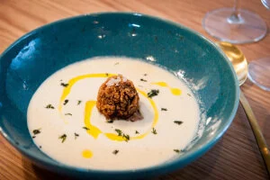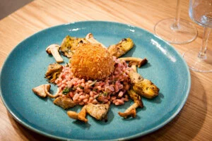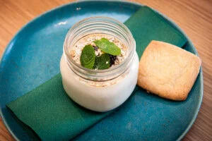 This was my fab veggie menu on the night, served on beautiful teal dishes, modern glassware and gold cutlery. Vegetarian haggis bon bon on chestnut puree, crispy poached egg on pearl barley risotto, and Scottish cranachan/pannacota. Totally delicious!