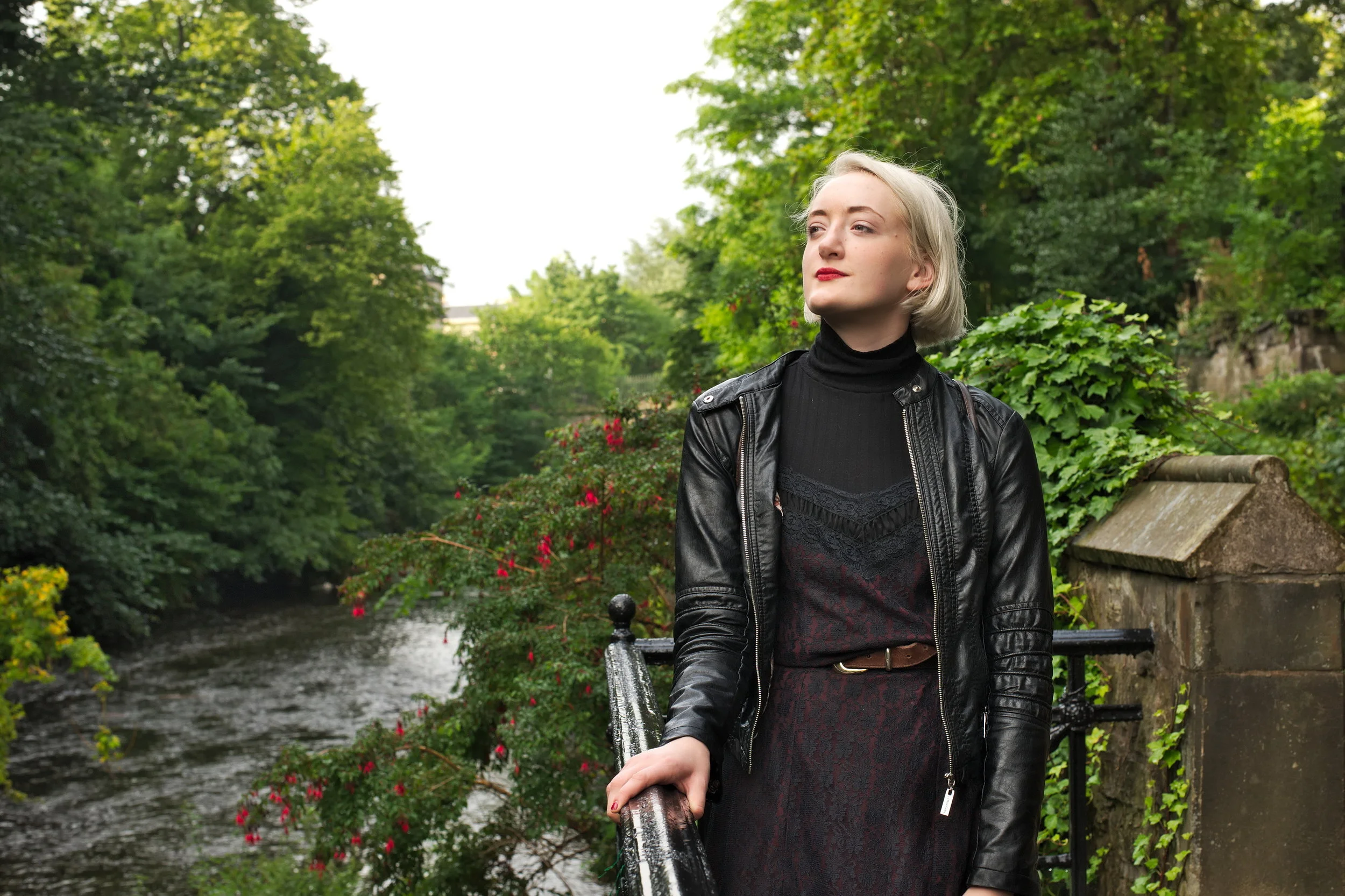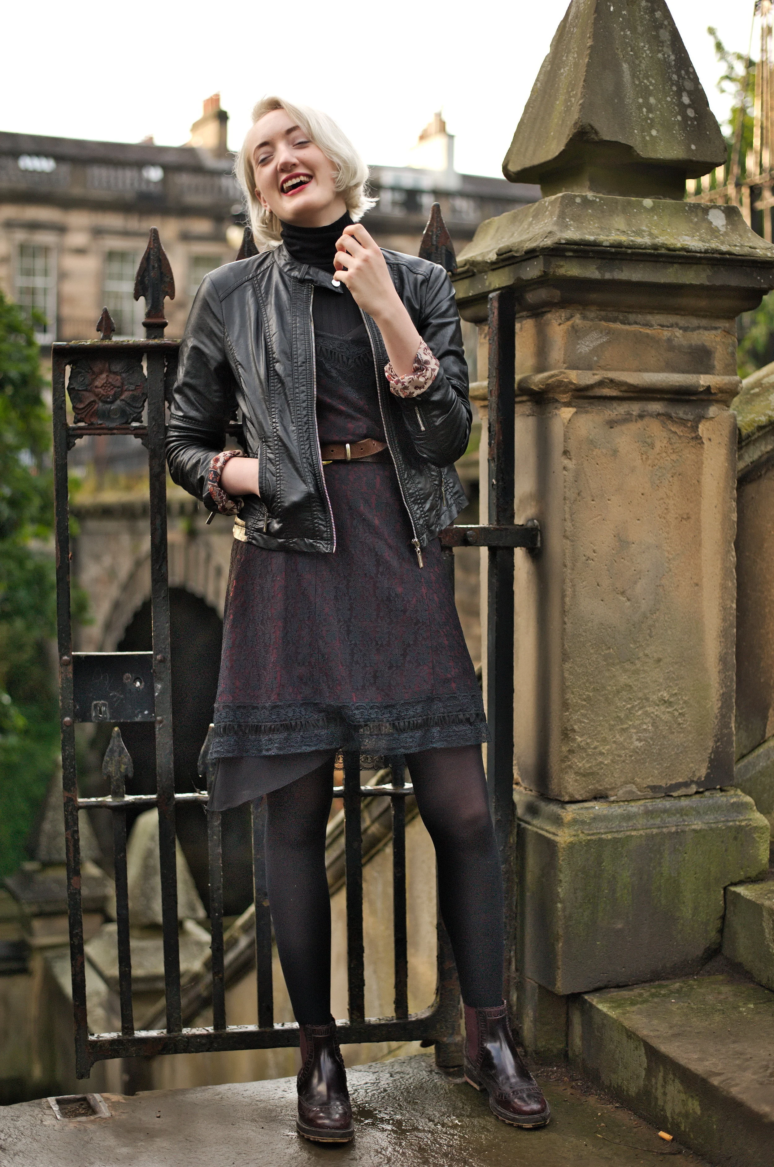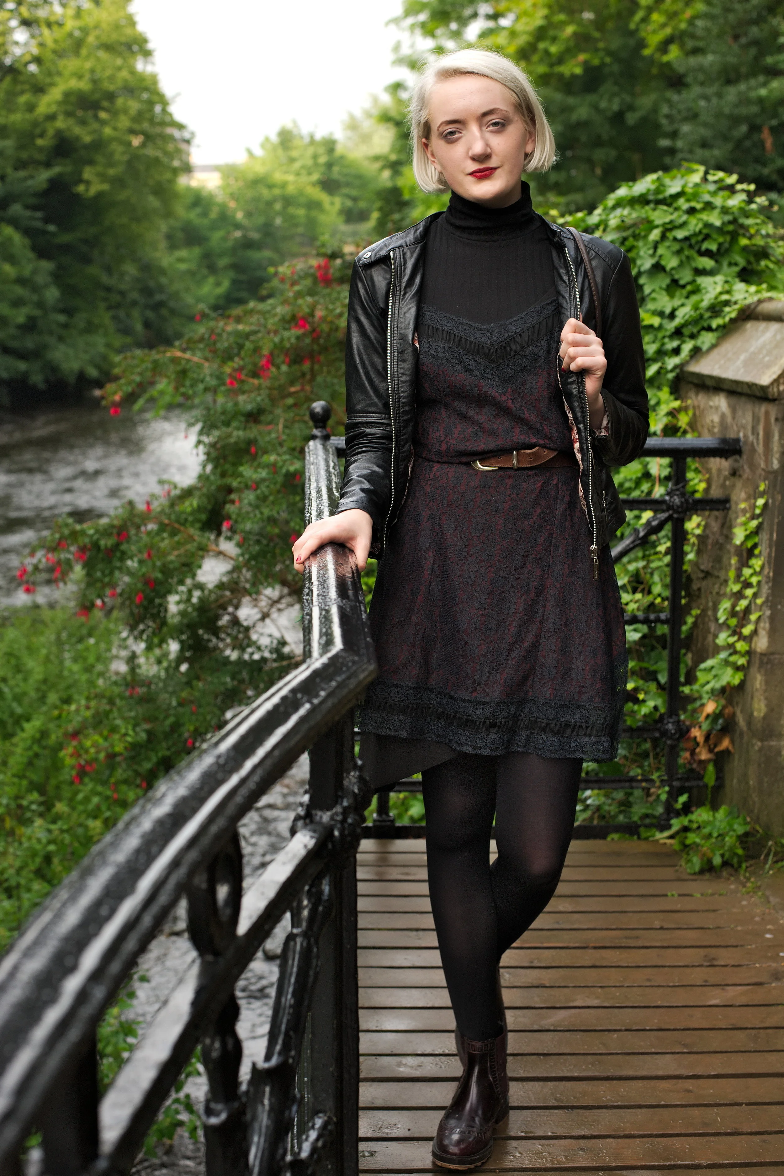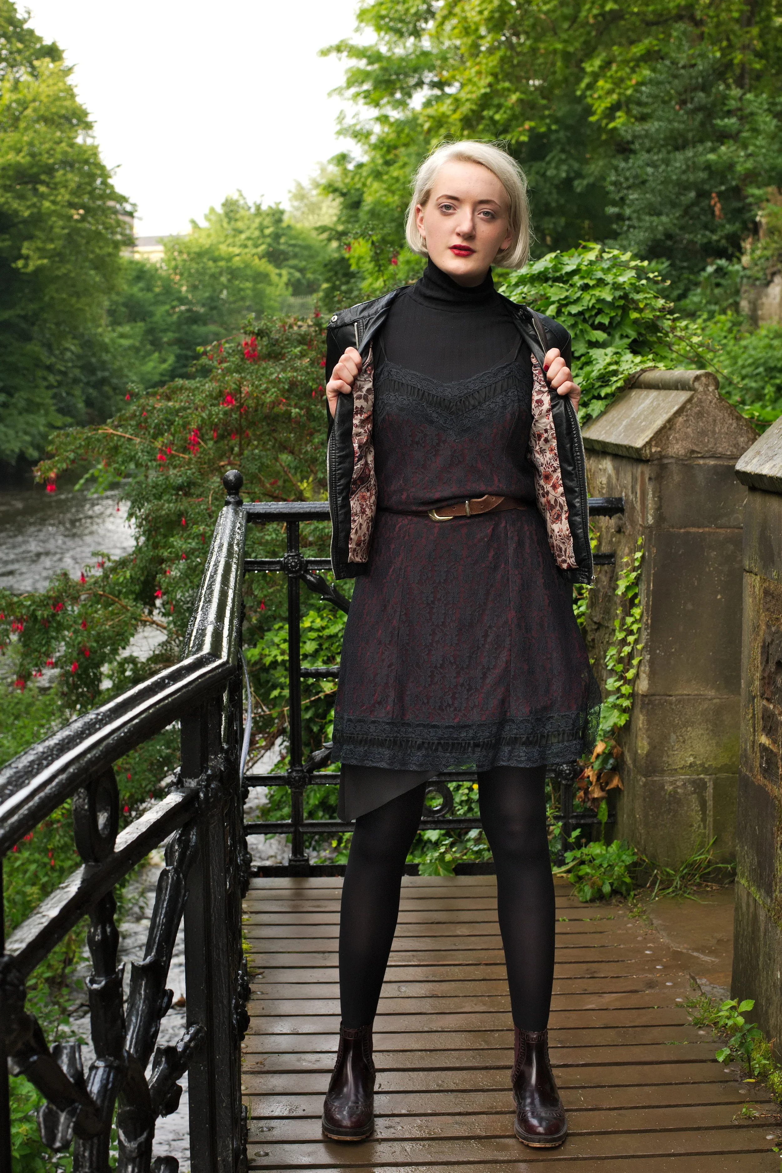 My latest outfit shoot was photographed by Ashley Erdman by the Water of Leith in Stockbridge, and features a 90's lace slip dress layered over a roll neck top, worn with burgundy chelsea boots and a classic biker jacket.