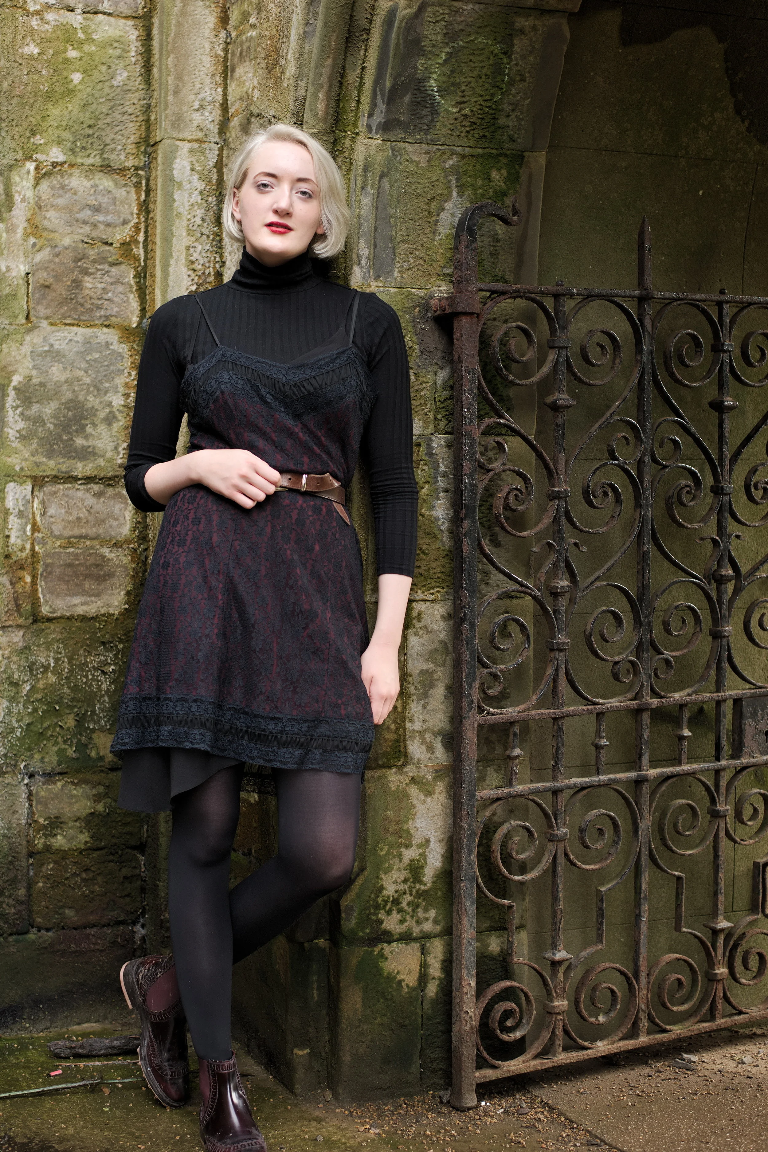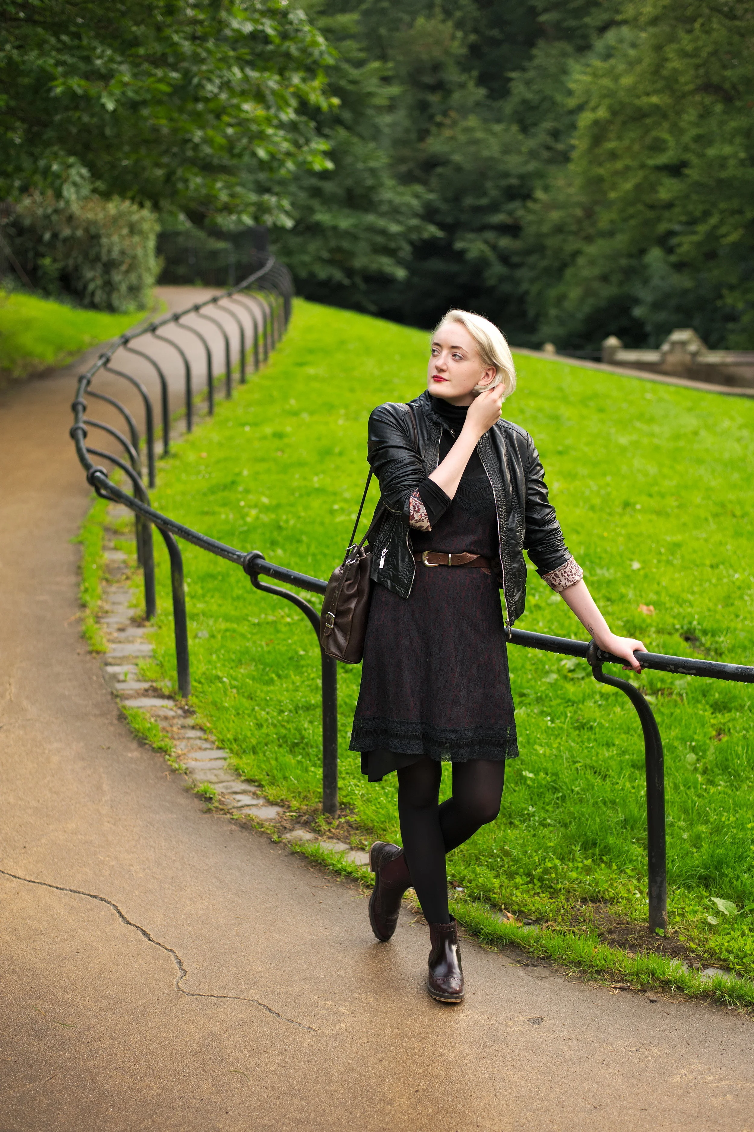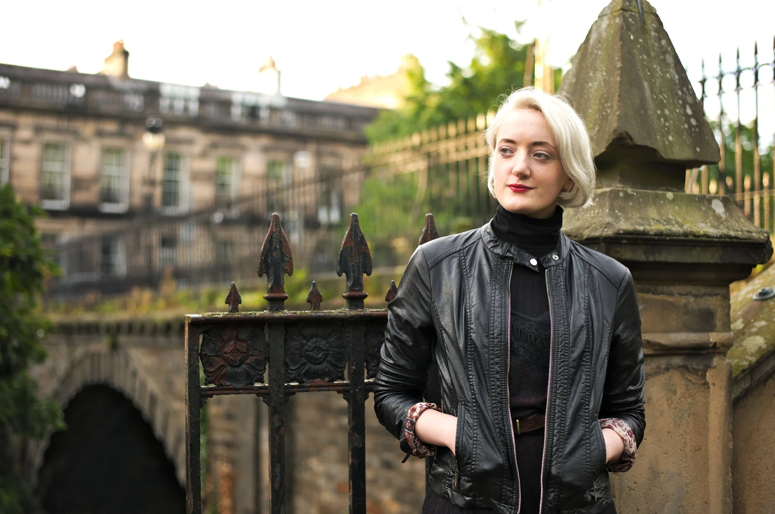 My latest outfit shoot was photographed by Ashley Erdman by the Water of Leith in Stockbridge, and features a 90's lace slip dress layered over a roll neck top, worn with burgundy chelsea boots and a classic biker jacket.