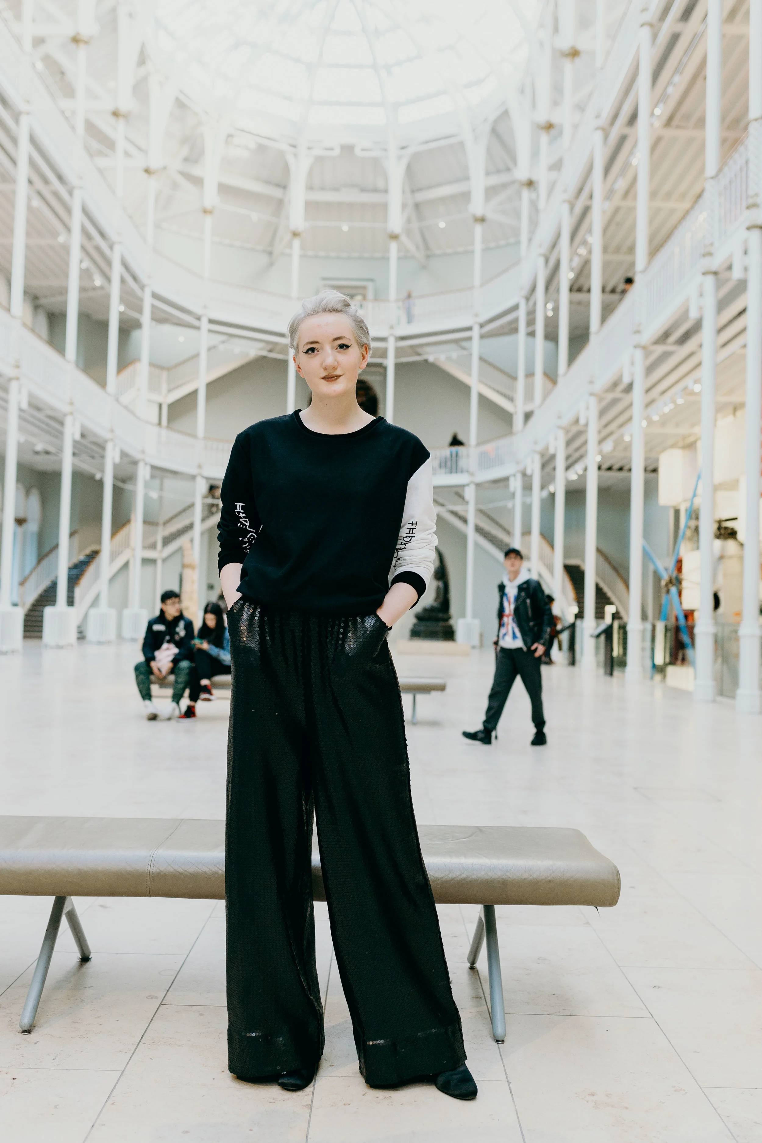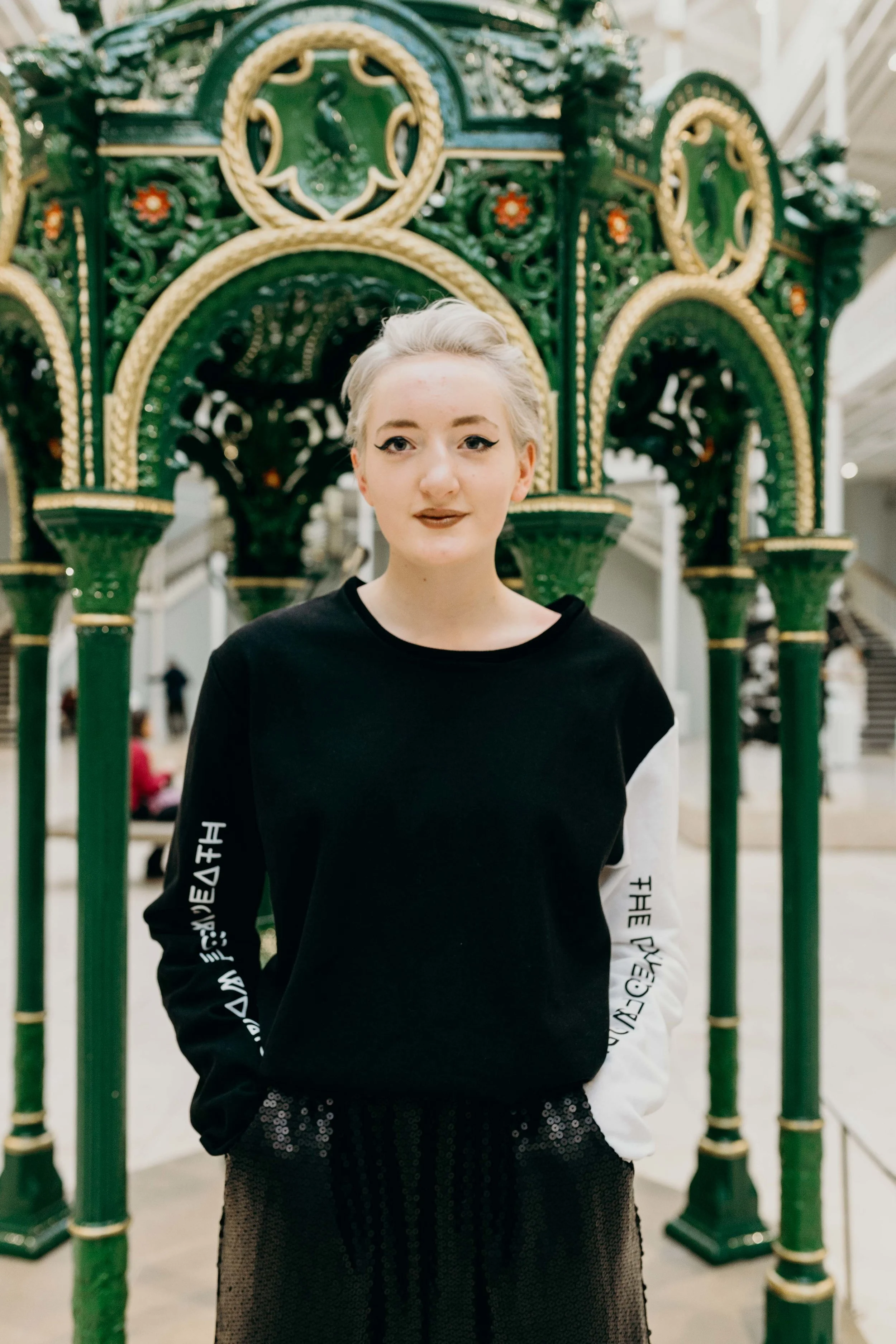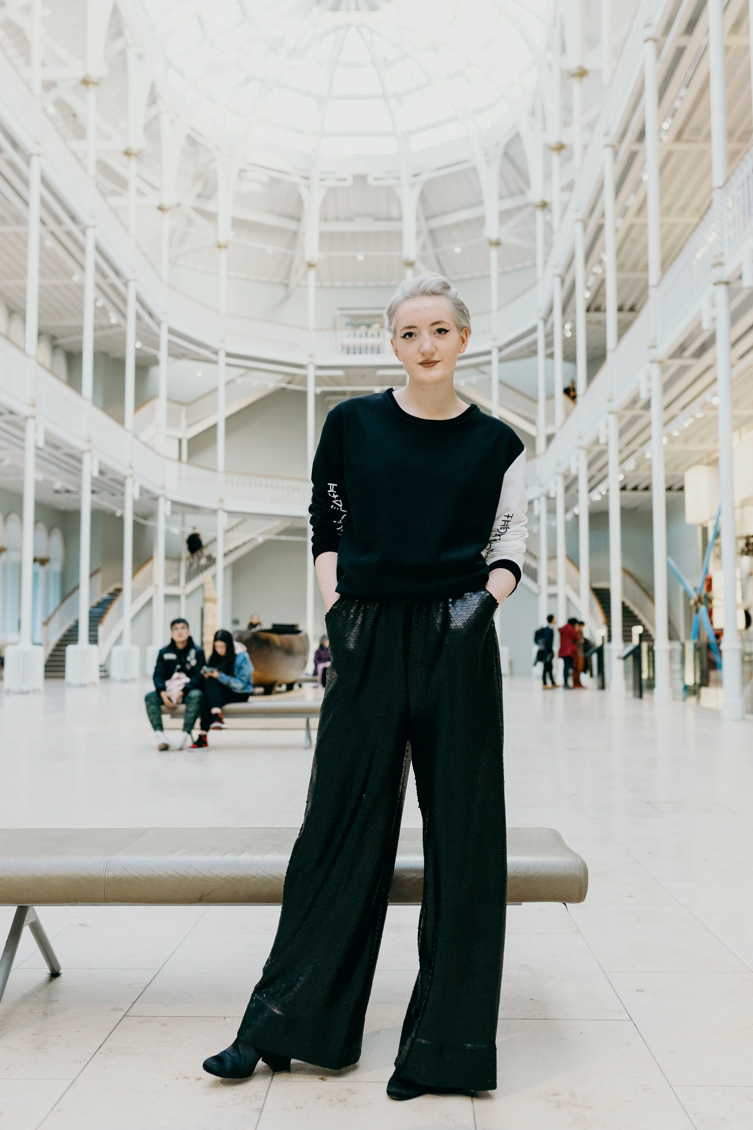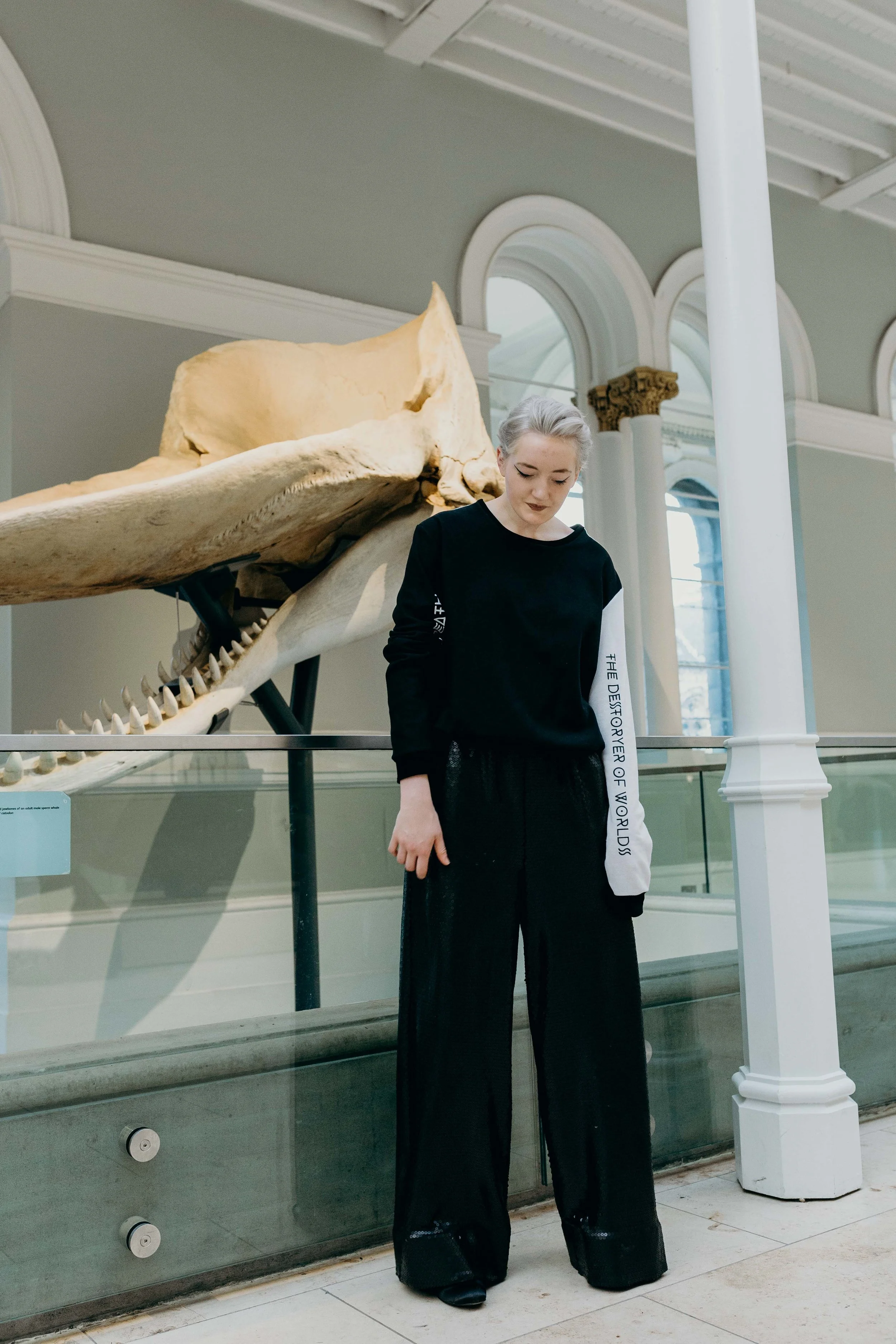 They can, however, prove very difficult to dress down, so when faced with a casual daytime photoshoot, I struggled to find a way to not seem like a total diva in the middle of a museum. Ryan Cowie to the rescue! Last year, I borrowed this sweatshirt from Aberdeen fashion designer Ryan Cowie for a university magazine editorial (see the lookbook and Ryan's full collection here), and my heart broke when I had to send it back. SO I bought it and kept in and now I'm wearing it all the time. I mean, look at it! Cropped and off the shoulder? Check. Extended long sleeves? Check. Monochrome and graphic? Check. Inspired by feminist witch covens? Well duh.