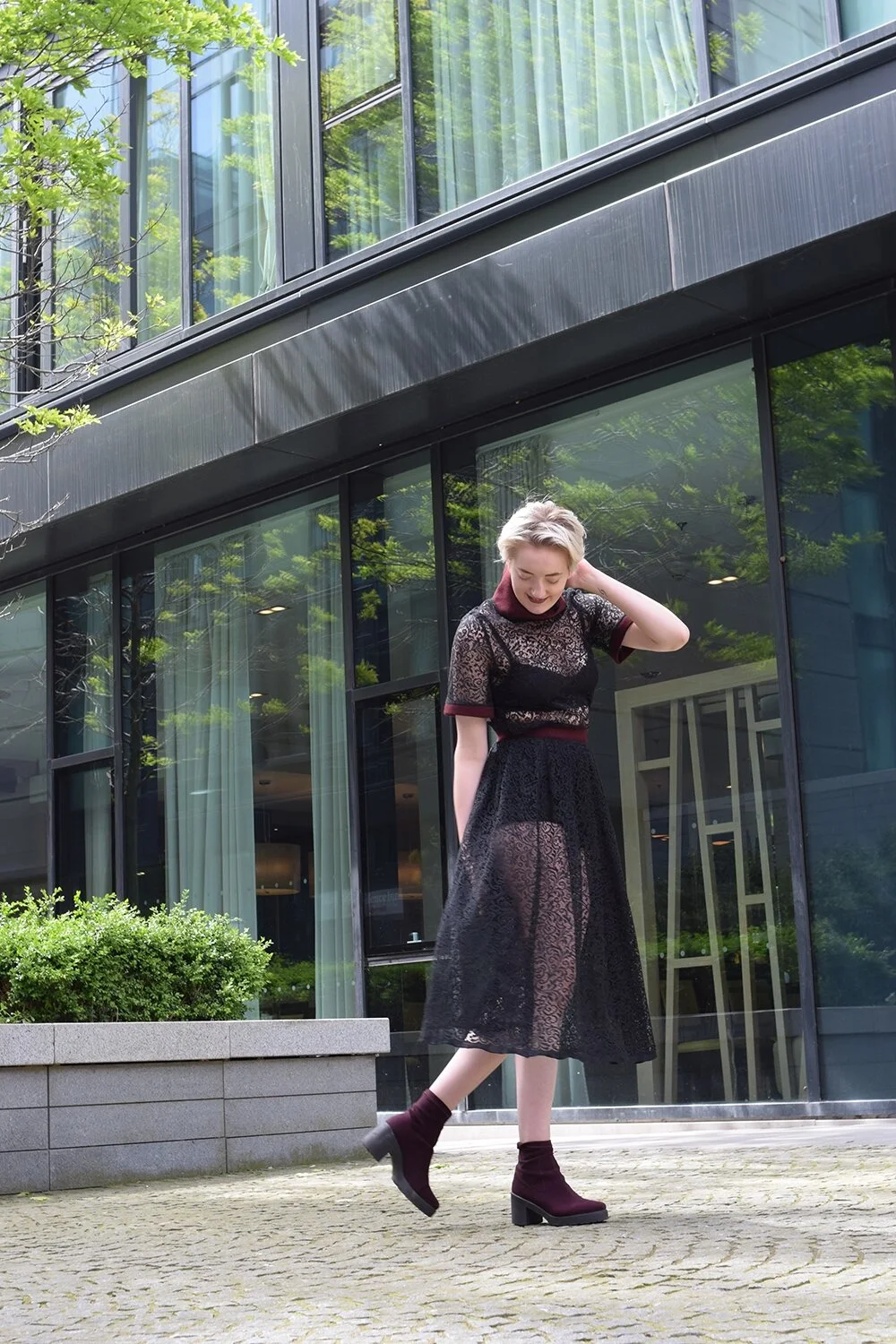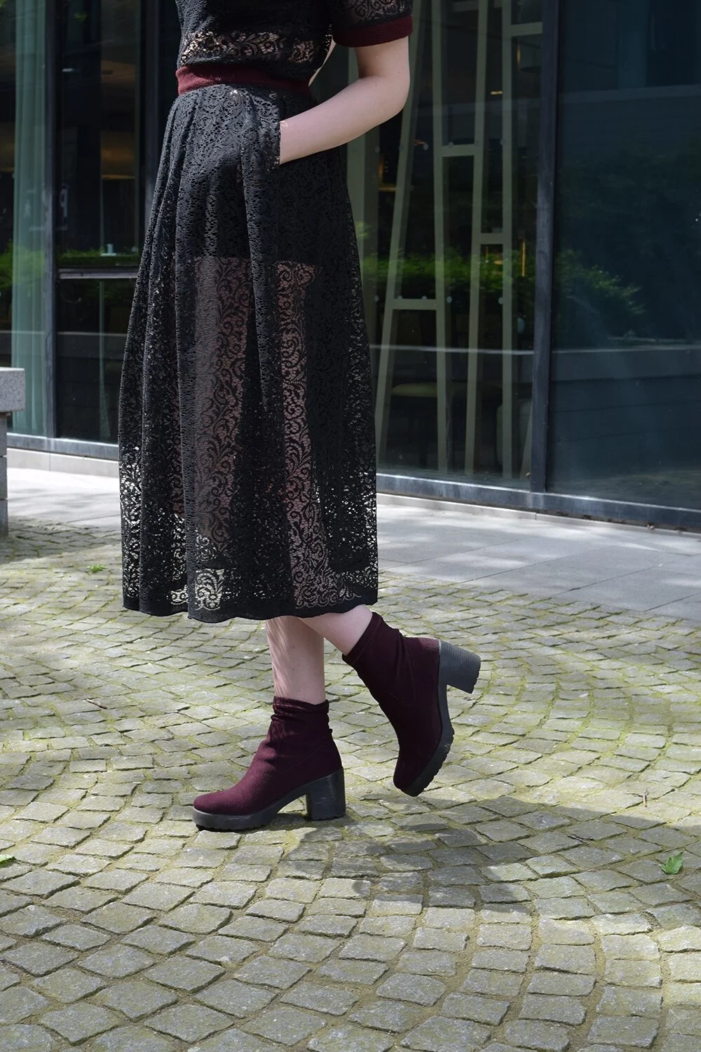 This blouse and a-line skirt were made to be paired together, although they look great as separates too (I styled the top with high waisted black jeans, and the skirt with an off-the-shoulder top). They can also be worn like I am here- with a bralet and mini shorts underneath, to make more of a statement, or if you want a little more modesty, the two-piece looks just as good with a tank top and black tights or an underskirt. I styled them with bare legs and chunky boots as it was a warm day when I shot this with the help of Alice Cruickshank (aka Twenty Something City).