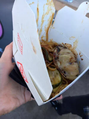 Later that evening, Jack and I returned to The Pitt for another round! By 8pm, it was absolutely kicking; the tunes were flowing as much as the prosseco, and we could hardly move for people. The boy went straight for a deep fried buttermilk chicken burger with spicy korean sauce with a side of -you guessed it- truffle parmesan fries, from Buffalo. I opted for Yaki Udon with vegetable gyoza from Harajuku Kitchen. I went to their restaurant in Bruntsfield a while back and loved the sushi, so I was excited to try more Japanese yummies.