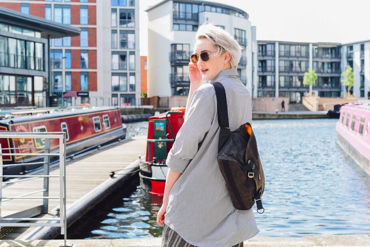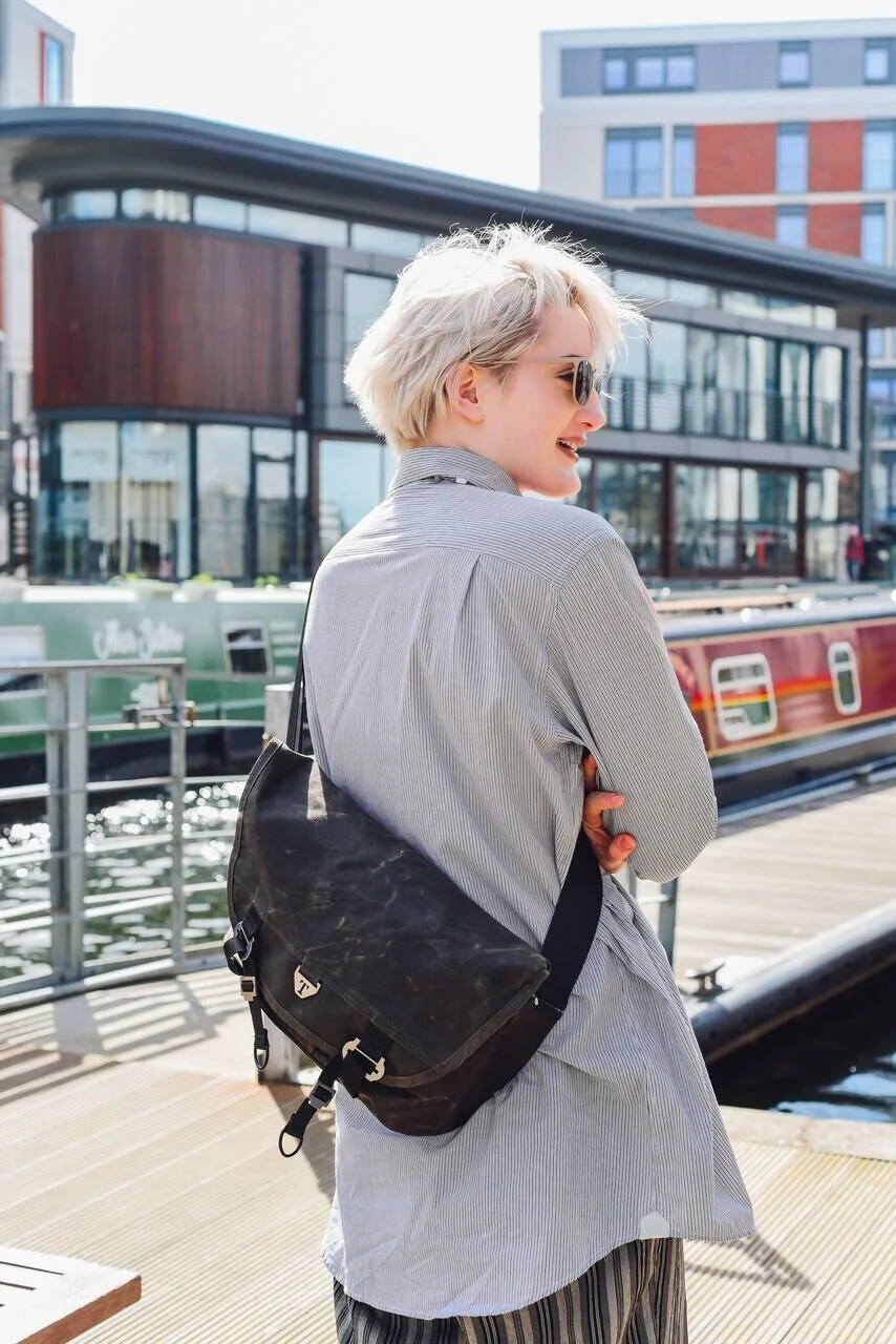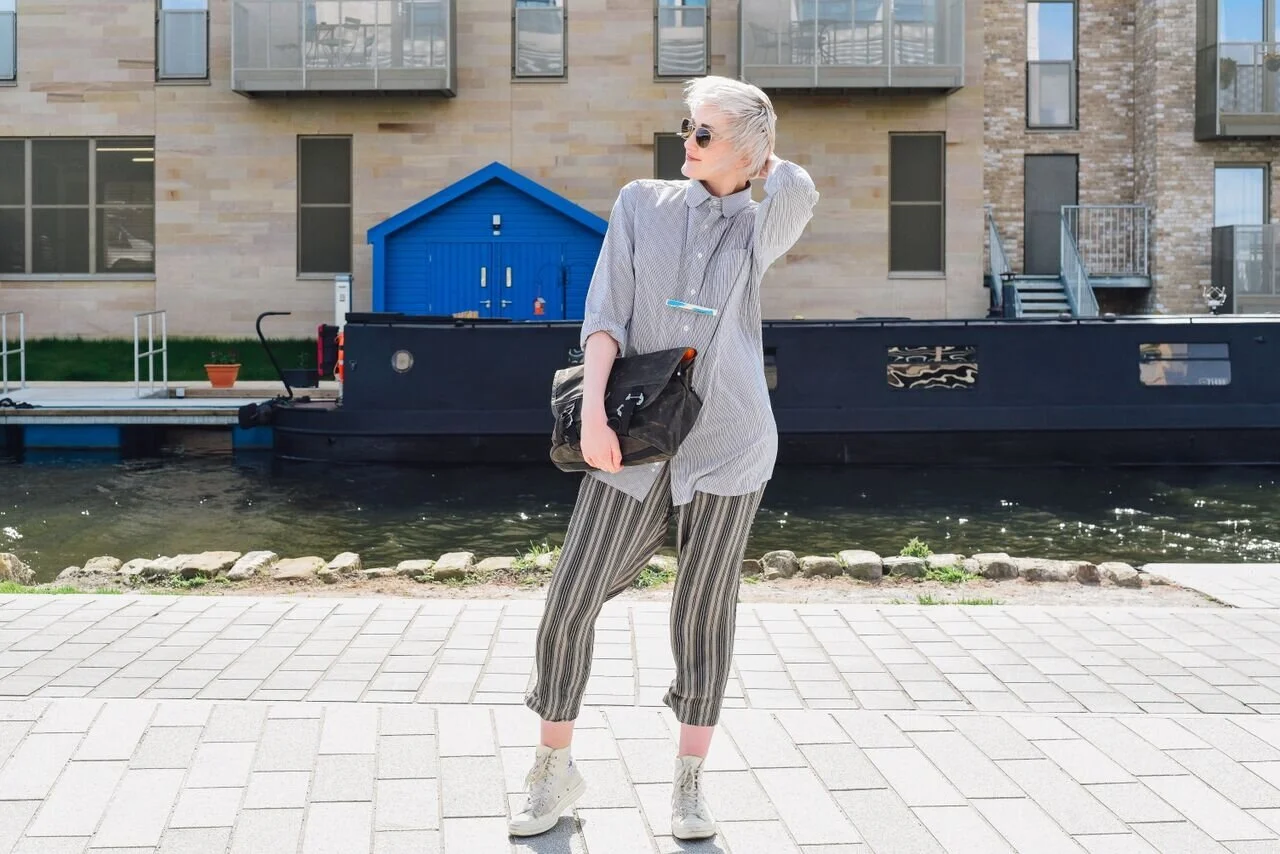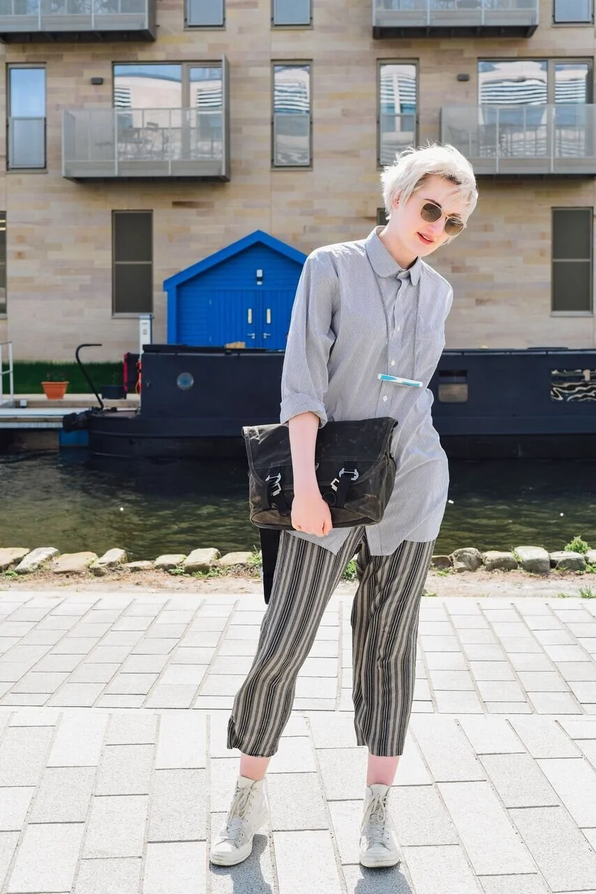 I decided to style the Trakke bag with an androgynous look to complement its outdoorsy feel. I wore a men's blue and white pinstripe shirt from Edinburgh tailoring and tweed label Walker Slater, which I recently bought for just £20 at the brand's outlet store on Victoria Street, with some cropped vinatge striped trousers from Godiva Boutique on Edinburgh's West Port. i accessorised the look with a ceramic necklace by contemporary jeweller Beth Lamont, a resident of Coburg House art studios, my much-worn sunglasses by Glasgow eyewear makers Iolla, and Comme des Garcons x Converse trainers.