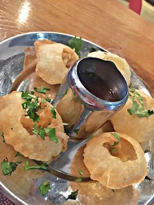 "The description of golgappa on the menu wasn’t hugely helpful (“you will have to taste it to experience it” is pretty much all it says) but seen as it was vegan we decided to throw caution to the wind and give it a try. It ended up being cold crispy puffs, served with a small dollop of sticky rice inside and some spicy sauce on the side. I poured a little sauce into my puff and ate the thing whole in one bite – it was certainly an interesting experience and one worth trying!"