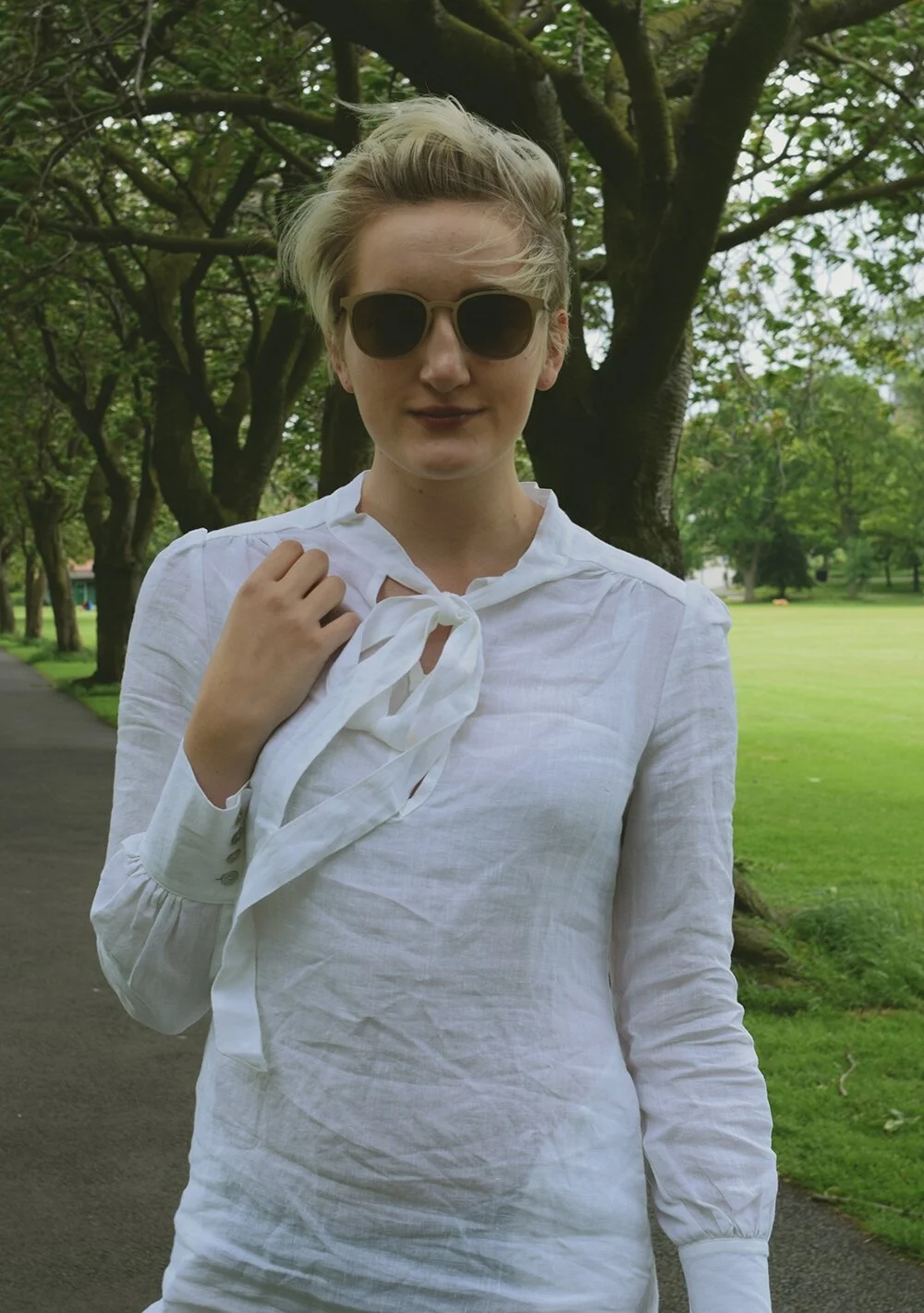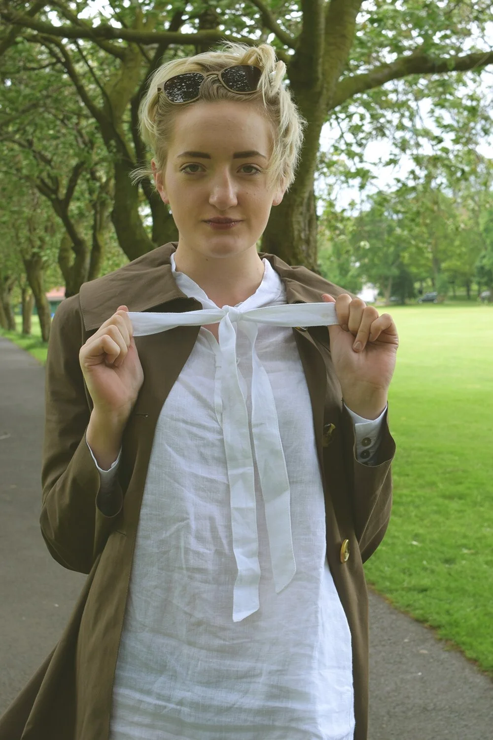 Elizabeth Martin | Elizabeth's range of tops and blouses made from crisp white linen by UK manufacturer John England are totally flattering and wearable. The best part? This 'Katie' shirt dress with the cute bow and pearl button detailing has pockets. That's right ladies, a shirt with pockets. What more could you want?