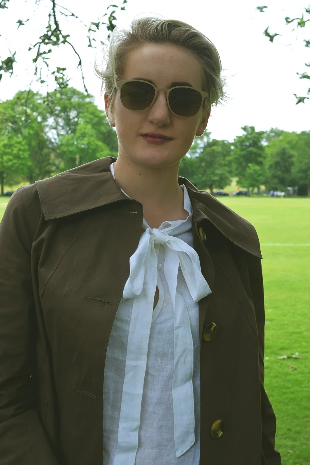 Shirt dress: Elizabeth Martin Raincoat: Elizabeth Martin Sunglasses: IOLLA Trainers: Po-Zu